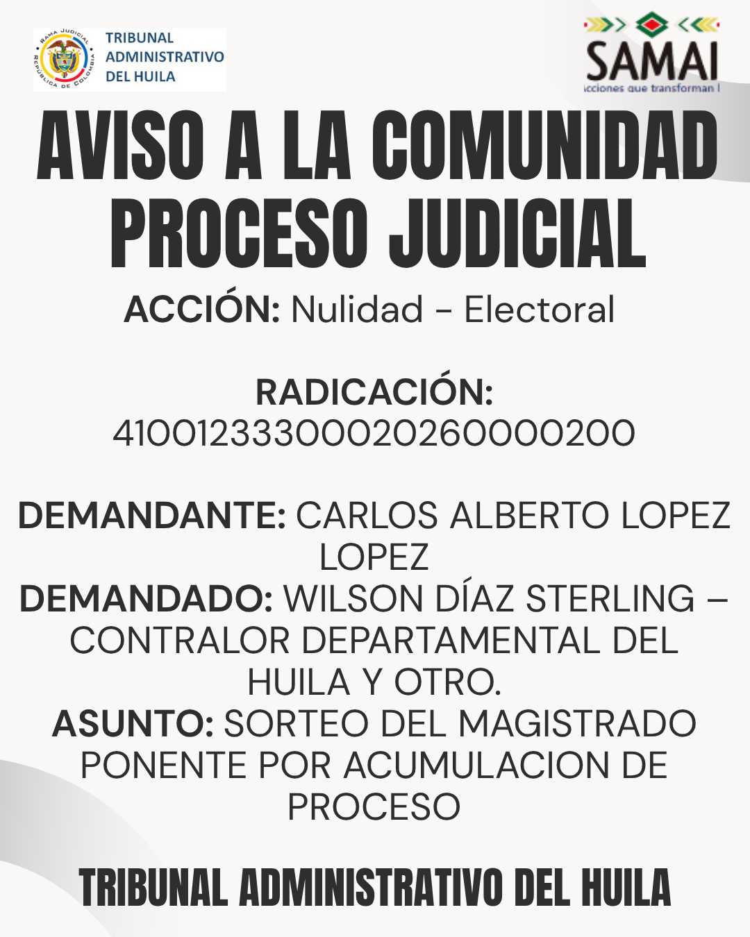 17 Abril 2026 AVISO A LA COMUNIDAD - SORTE MAGISTRADO PONENTE AUTO ORDENA SORTEO DE ACUMULACIÓN tweet